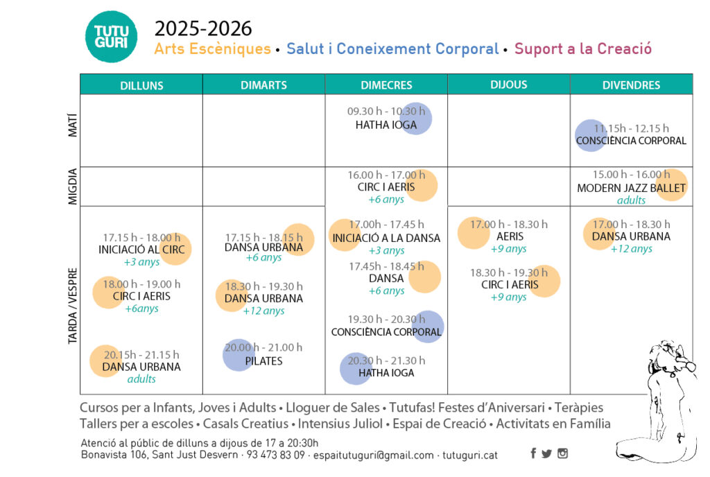 Us donem la benvinguda al TUTUGURI! Al Tutuguri ens adrecem a totes les edats convidant a viure la dansa, el circ i d’altres expressions artístiques a través del moviment. Aquí també hi trobaràs un espai on relaxar-te, conèixer el teu cos i posar-te en forma.