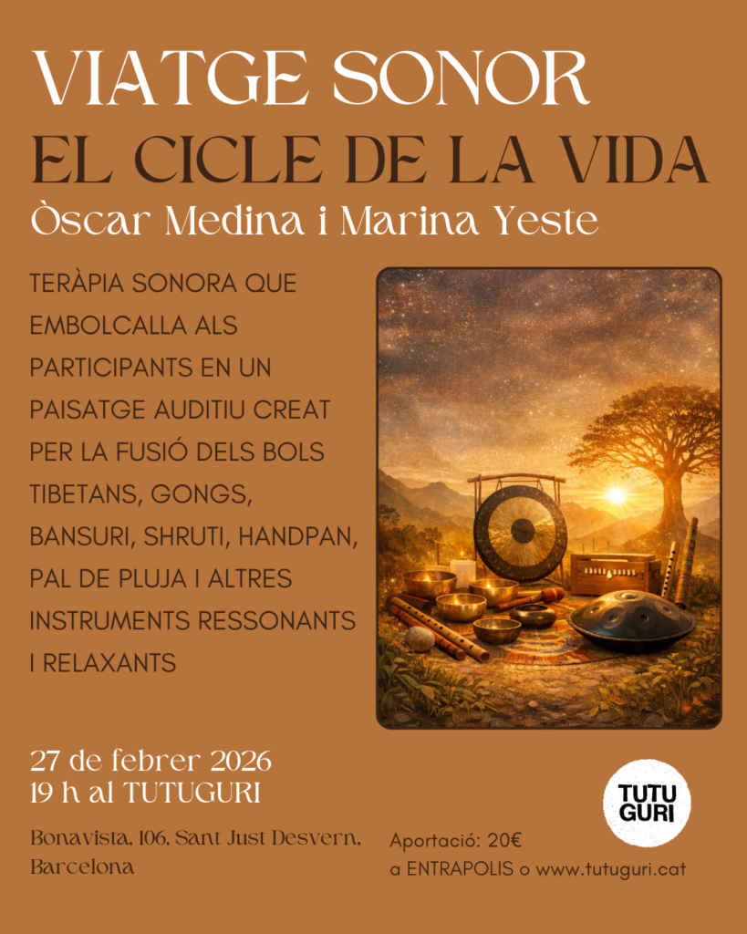 Teràpia sonora que embolcalla als participants en un paisatge auditiu creat per la fusió dels Bols Tibetans, Gongs, Bansuri, Shruti, Handpan, Pal de Pluja i altres instruments ressonants i relaxants.